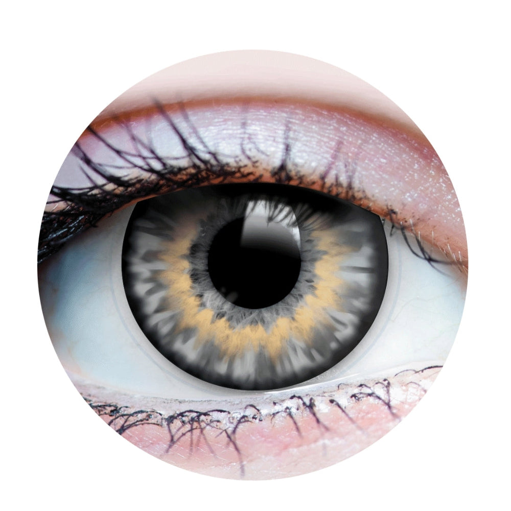 SUNRISE ASH circle lenses feature a richly-hued gradient going from honeyed brown centered around the pupil to a declination of grey tones that radiate toward a dark brown outer ring.