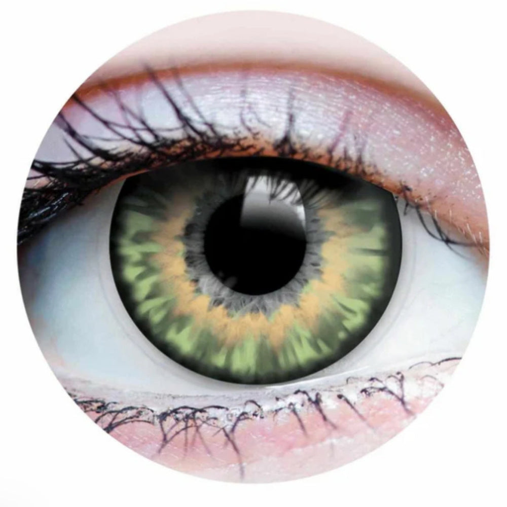 On light natural eyes, the solar quality of these beauty lenses comes through, with the light green tones of the iris surrounding a bright golden brown center.