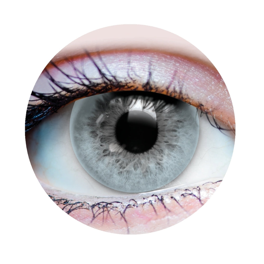 On light natural eyes, these coloured contact lenses show off their soft side, in subtle blue-grey shades.