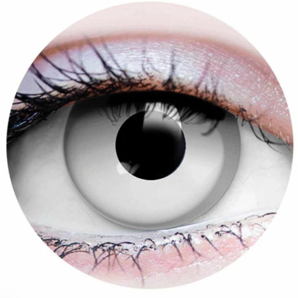 ZOMBIE I colour contact lenses features an opaque white iris. It completely covers any eye colour and features a standard sized transparent pupil for comfortable vision. It is a versatile design that adds a shock factor to any cosplay look.