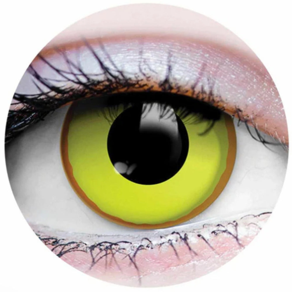 NIGHTCRAWLER Halloween coloured contact lenses features an opaque neon yellow iris and neon orange outer ring. Bright and vivid, NIGHTCRAWLER is a versatile contact lens great for cosplaying an elf, comic book characters, aliens, futuristic human hybrids etc. Funky coloured contact lenses.