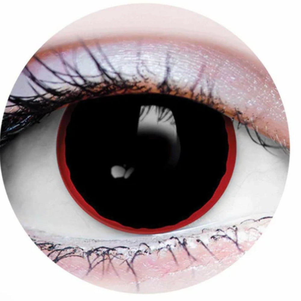 HELLRAISER contact lenses feature a transparent pupil with an opaque black iris and red outer ring. This design widens eyes and gives a dramatic possessed look. Funky coloured contact lenses perfect for Halloween.