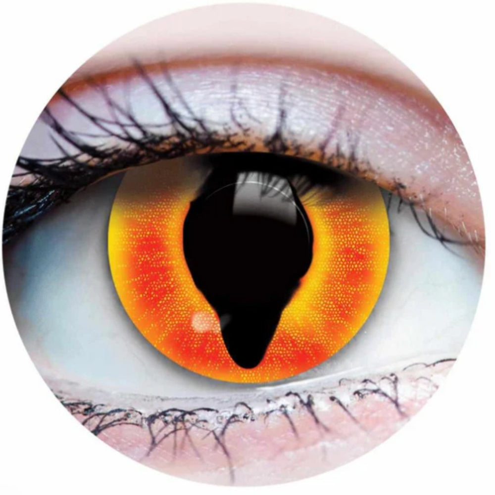 DIABLO colored contacts features a transparent cat eye pupil down an opaque orange with a reptile pattern of yellow and red colour combination on the iris. Commonly used for a reptile effect, the illuminated center makes it versatile and can be used for anime cosplay.
