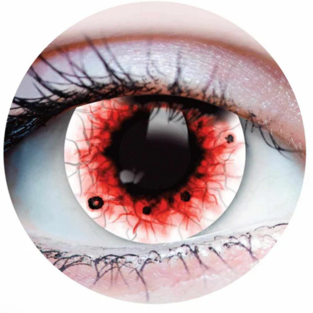 WRAITH II colored contact lenses features a transparent pupil with opaque white background, red veins and blood cloud permeate the center of the lens with black flecks spread throughout the iris to give a bewitching effect.