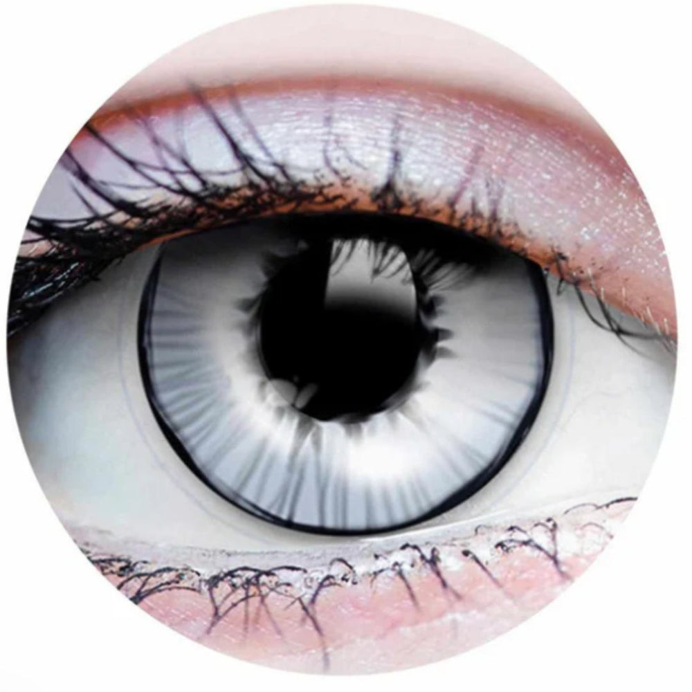 GHOST contact lens design features a smokey white opaque base and black limbal ring that gives eyes the illusion of glass, grey clouds, or a mirror to another world. A spooky yet versatile lens, this design can be used year round for cosplay or glam looks.