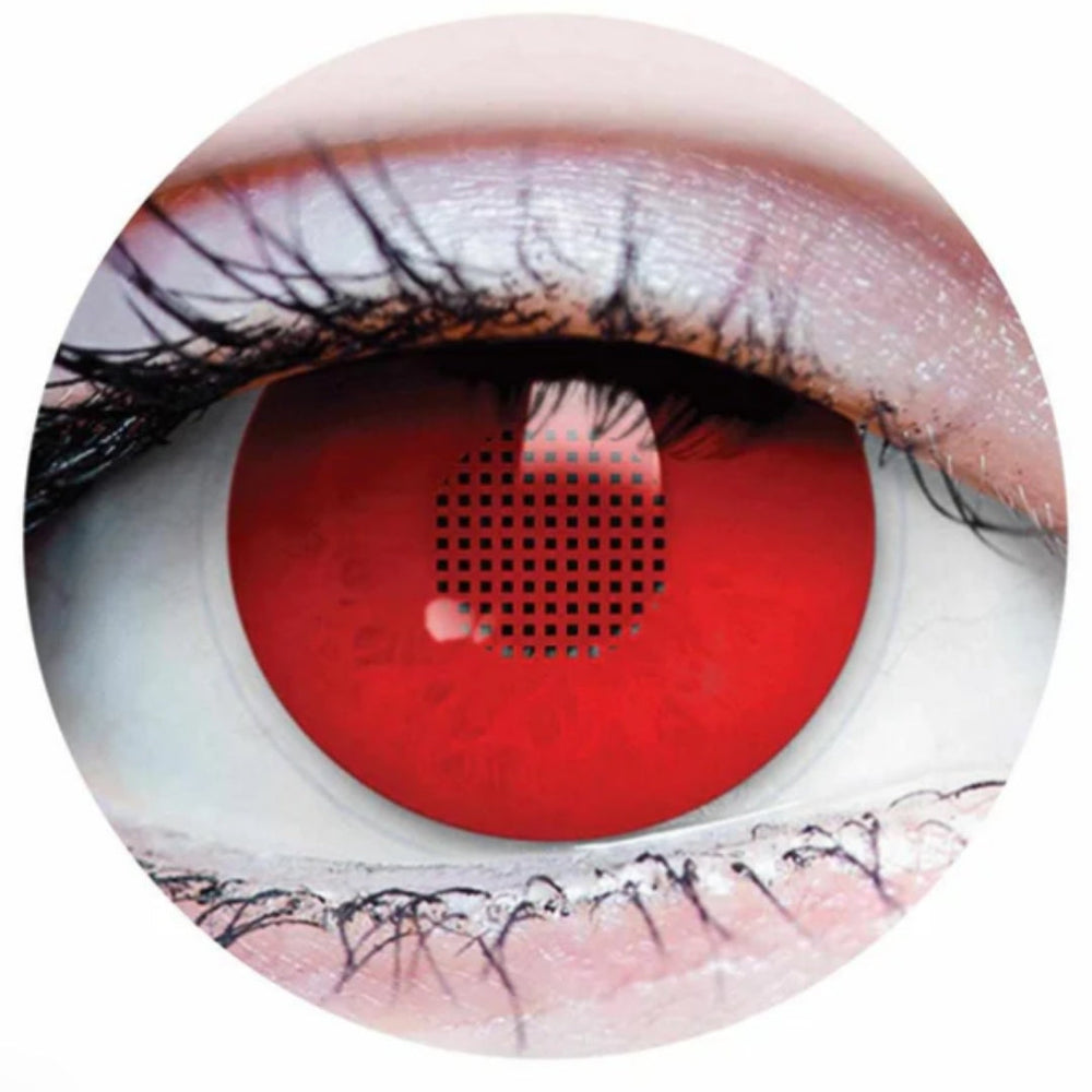 X-RAY Colored contact lenses feature an opaque red all over iris and see-through mesh pupil for ease of vision. Create a red blind eye effect for cosplays of possessed witch, gremlin, demon or rage monster. Or use it for an original creepy and spooky glam makeup look.