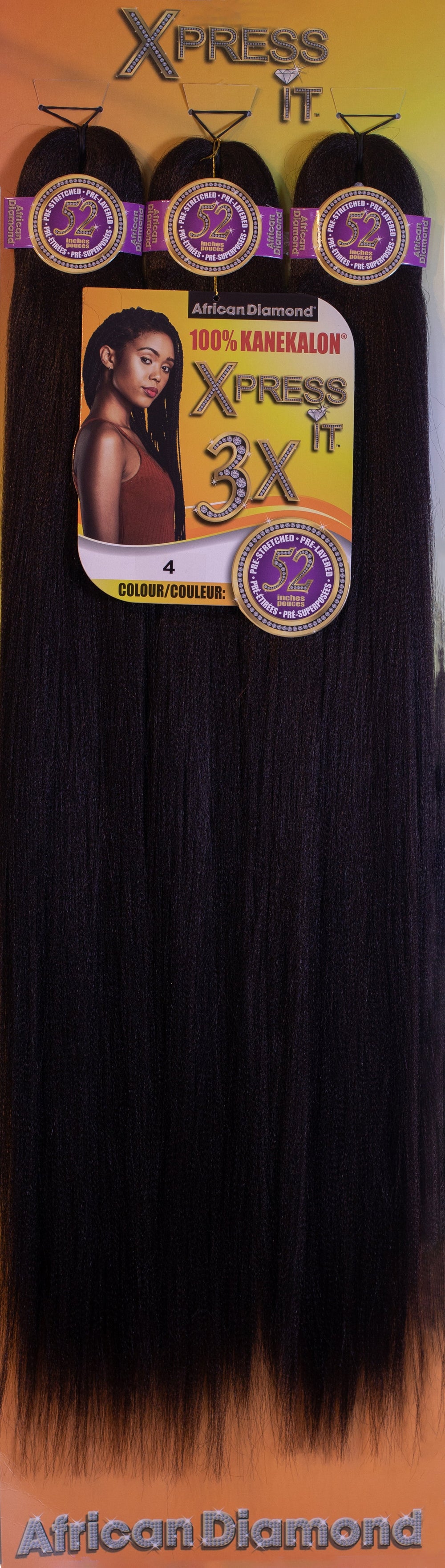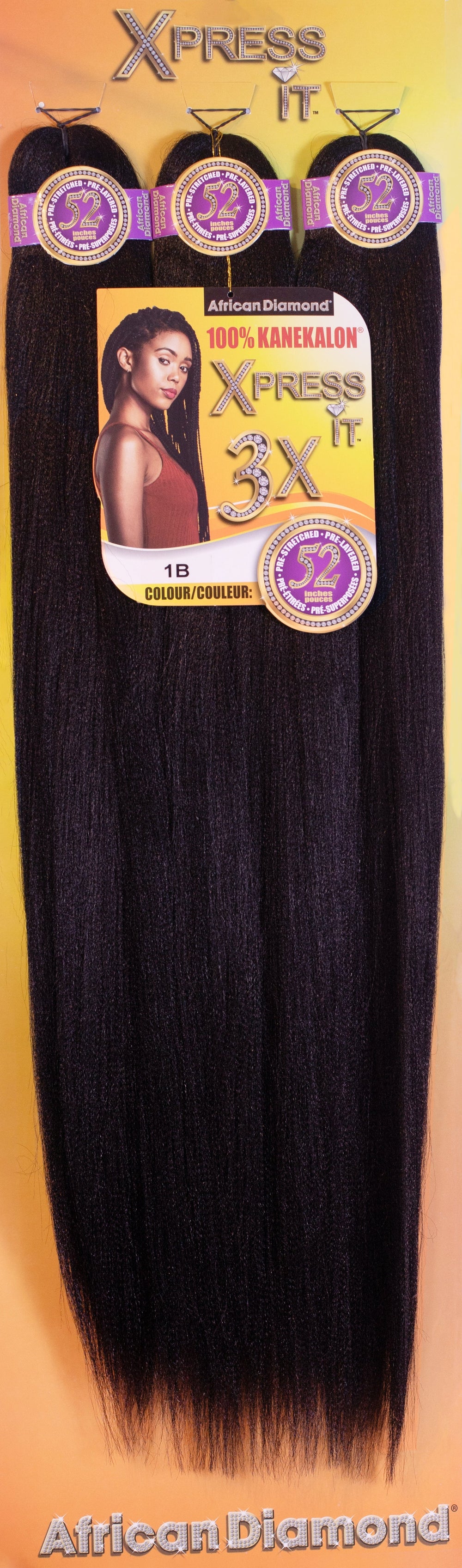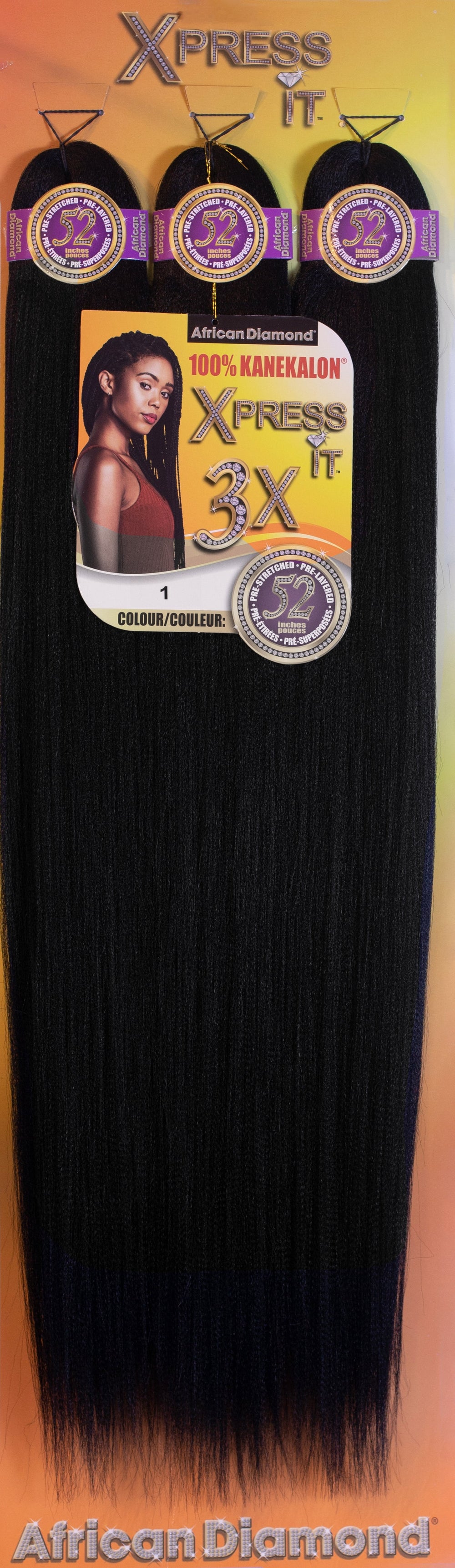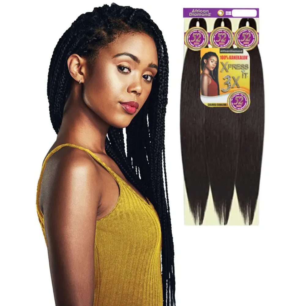 African Diamond 3x Pre-stretched 52" features 100% Kanekalon fiber, pre-layered for a natural look. This ultra-lightweight hair is designed to resist tangling and is compatible with hot water setting techniques, ensuring easy styling and long-lasting wear.