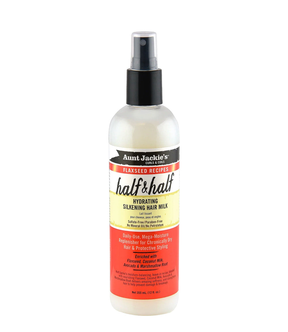 ""Aunt Jackies Flaxseed Half n Half 12oz Great For Part moisture balancer and part softening remedy for seriously parched tresses. What will it do for my hair? Refresh dry, thirsty natural hair with Aunt Jackie’s new Flaxseed hair milk recipe. Formulated with nourishing Coconut Milk, Avocado and Marshmallow Root, this hydrating remedy not only moisturizes, but helps detangle and soften. Rich in Omega fatty acids, Flaxseed is widely used to help prevent thinning & shedding, and for improving hair’s health, overall. Go ahead… give your hair a drink! Great for use on hair types 1a-4c, and as an excellent moisture therapy for protective styling. Instructions Use as often as you shampoo & condition hair. On clean & conditioned damp hair, lightly saturate hair with Half & Half Hydrating Silkening Hair Milk. Using a wide tooth comb, starting with the ends of hair and working upward toward the roots, gently comb through hair. Do not pull through tangles. Apply more to especially tangled or knotted areas, as needed, and continue to comb through. Style as usual. For optimal use, clean hair with Aunt Jackie's Sulfate-Free Purify Me Co-Wash Cleanser, and then repairing damaged hair with Fix My Hair Intensive Repair Conditioning Hair Masque. Ingredients Water, Glycerin, Amodimethicone, Polysorbate 20, Parfum, Di-PPG-2-Myreth-10 Adipate, Althea Officinalis Root Extract, Phenoxyethanol, Trideceth-12, Acrylamidopropyltrimonium Chloride/Acrylamide Copolymer , Cetrimonium Chloride, Ethylhexylglycerin, Hydrolyzed Keratin, Citric Acid, Dehydroacetic Acid, Linum Usitatissimum Seed Oil, Cocos Nucifera (Coconut)Oil, Persea Gratissima (Avocado) Oil, Tocopherol, Pentaerythrityl Tetra-di-t-butyl Hydroxyhydrocinnamate, Linalool, Butylphenyl Methylpropional, Benzyl Alcohol, Hexyl Cinnamal, Alpha-Isomethyl Ionone, Coumarin, Geraniol, Hydroxycitronellal, Citronellol""