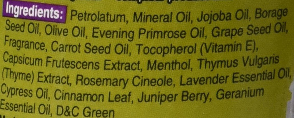 Petrolatum, Mineral Oil, Jojoba Oil, Borage Seed Oil, Olive Oil, Evening Primrose Oil, Grape Seed Oil, Fragrance, Carrot Seed Oil, Tocopherol (Vitamin E), Capsicum Frutescens Extract, Menthol, Thymus Vulgaris (Thyme) Extract, Rosemary Cineole, Lavender Essential Oil, Cypress Oil, Cinnamon Leaf, Juniper Berry, Geranium Essential Oil, D&C Green.