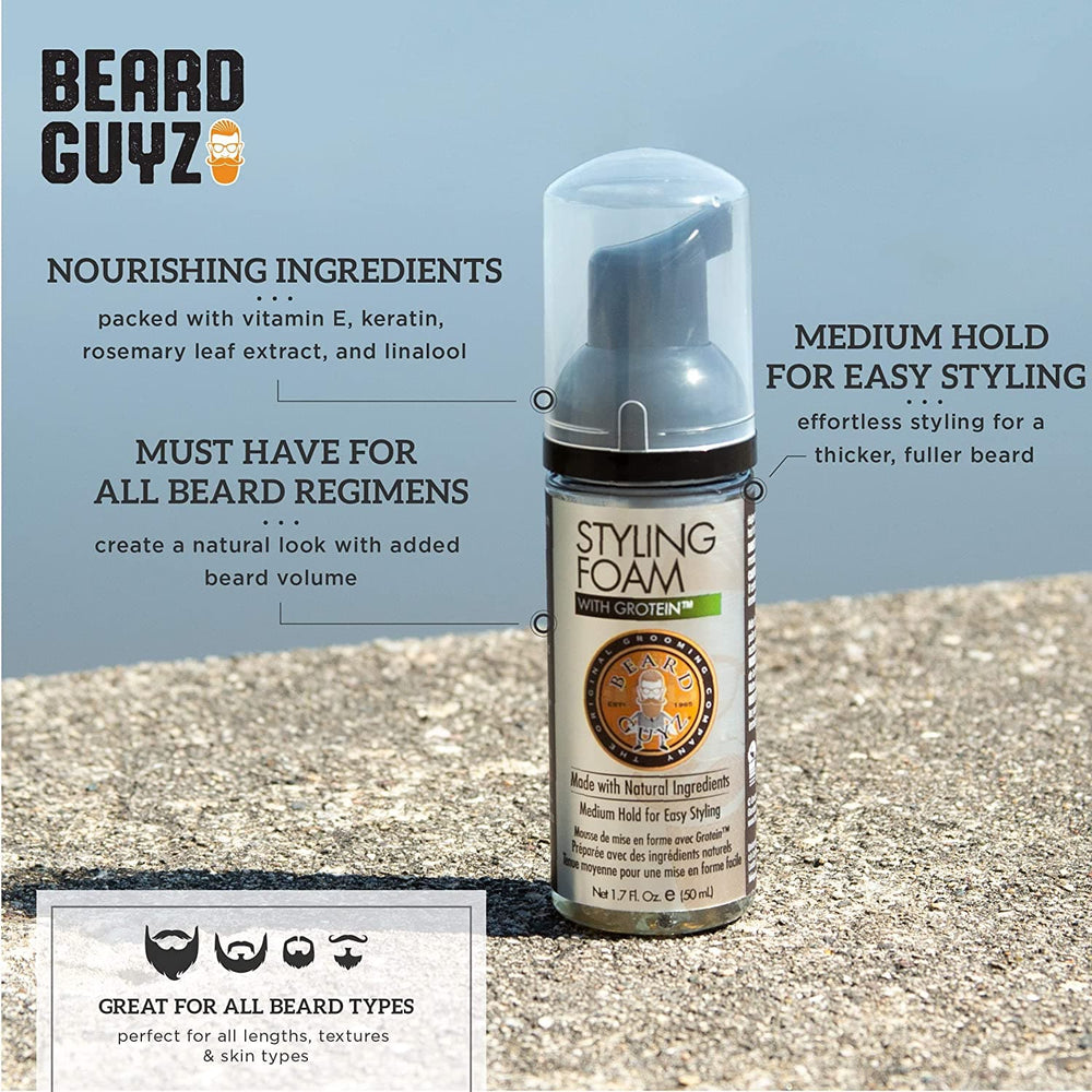 Beard Guyz Styling Foam with Grotein is here to give your beard a moisturizing pick-me-up. Easily detangle facial hair and maintain your beard's style the whole day the whole day through. Our unique Grotein blend is made with natural ingredients to leave you beard feeling happy and healthy.