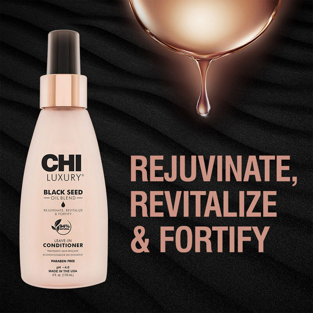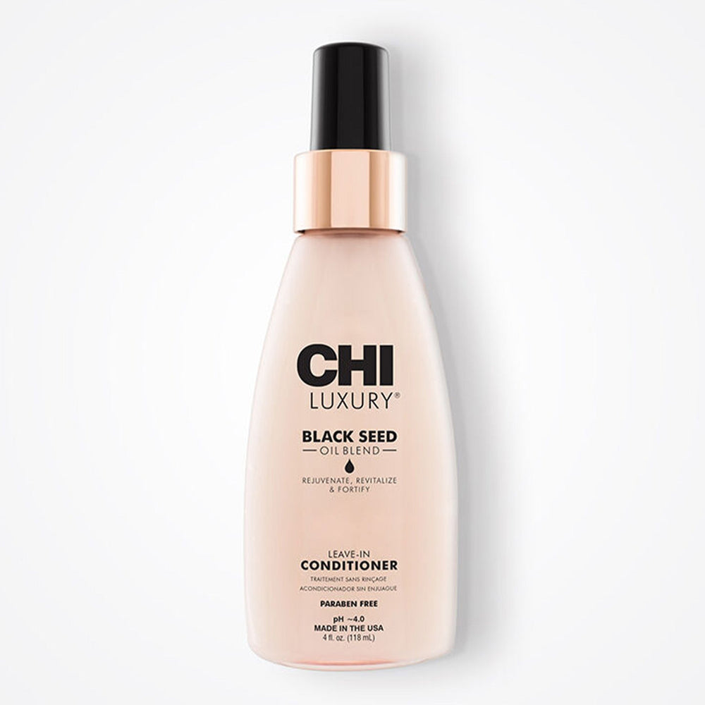 The CHI Luxury Black Seed Oil Blend Leave-In Conditioner delivers instant softness and manageability with a lightweight, non-greasy feel. This nourishing spray helps detangle, smooth frizz, and add a natural healthy-looking shine while protecting hair before styling. Perfect for daily moisture on all hair types.