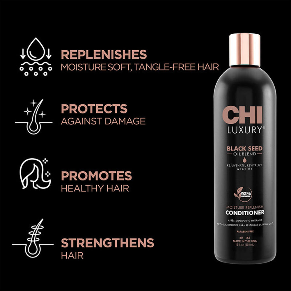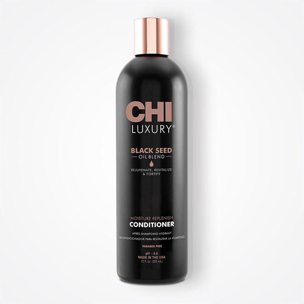 Quench dry lengths with CHI Luxury Black Seed Oil Blend Moisture Replenish Conditioner. This creamy, rinse-out formula infuses lightweight moisture, detangles for easy comb-through, and leaves hair feeling soft, smooth, and manageable with a healthy-looking shine—perfect as your daily post-shampoo hydrator.