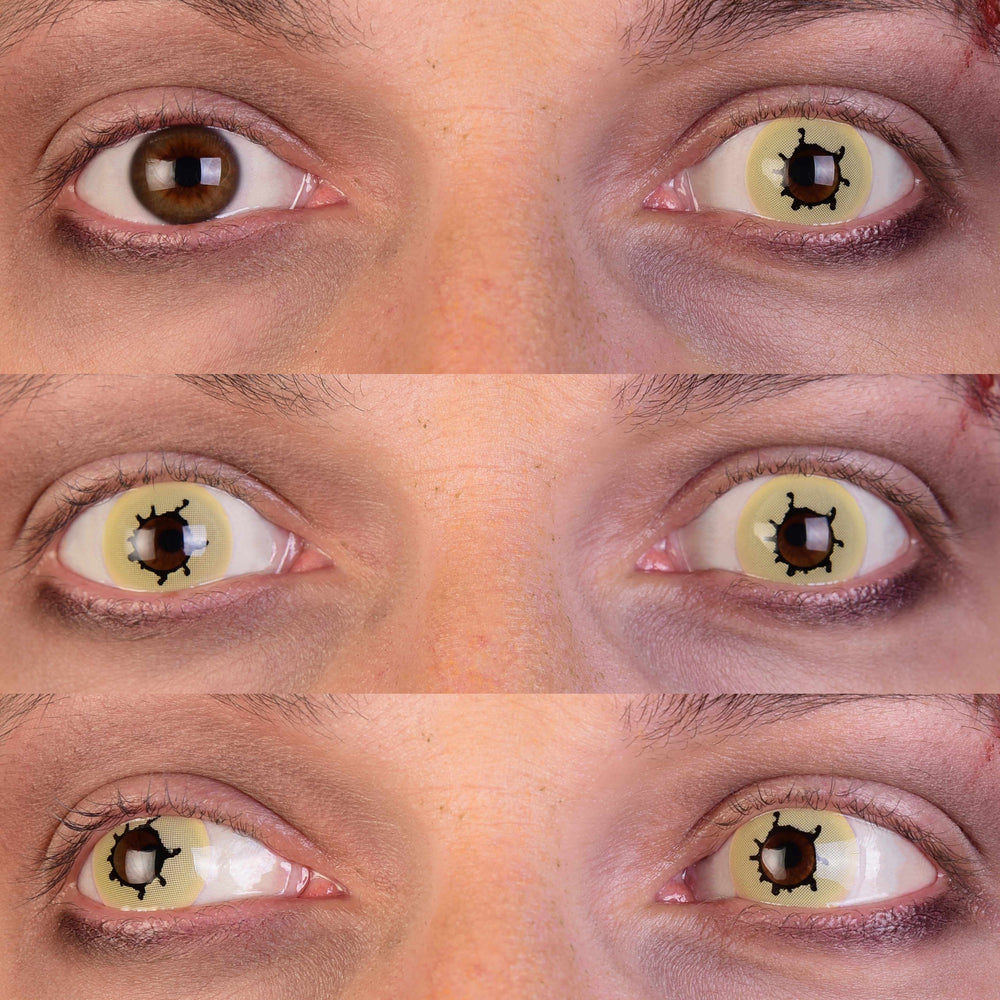 Step into the realm of the infected with Contagion I, a masterpiece of unsettling design. These colored contact lenses are not for the faint of heart. They feature a sickly, yellowish base—the color of pallid flesh clinging desperately to life. Across this desolate base are tendrils of hazy grey, like a creeping fog or the insidious spread of a malevolent disease.