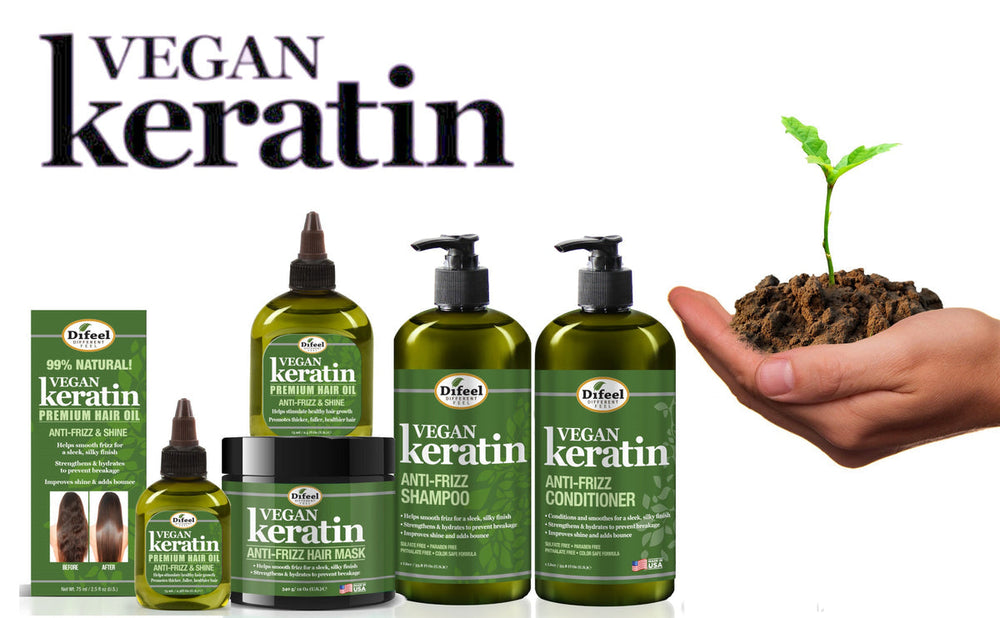 Difeel Vegan Keratin Anti Frizz Shampoo & Conditioner is 100% Vegan Safe, cruelty free and contains no animal products.