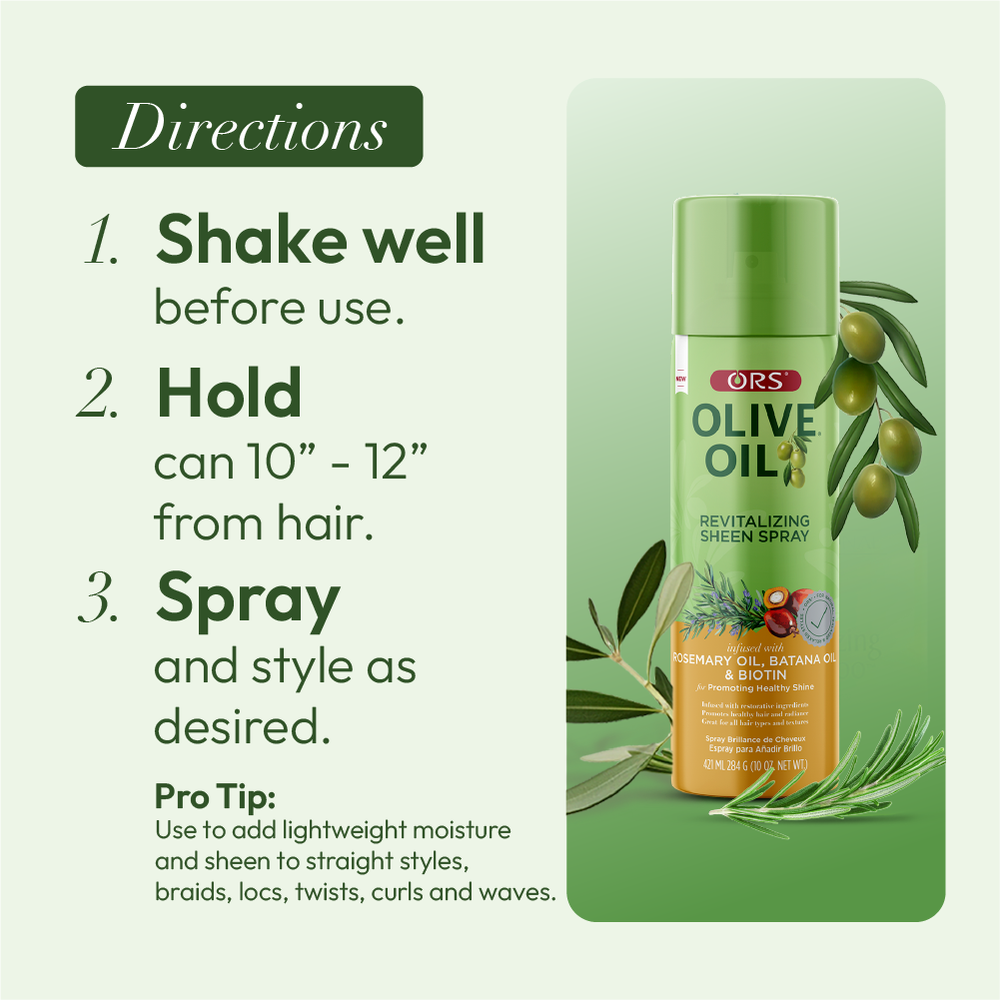 ORS Olive Oil Revitalizing Sheen Spray is formulated to restore hair strength while providing moisture and luminous shine.