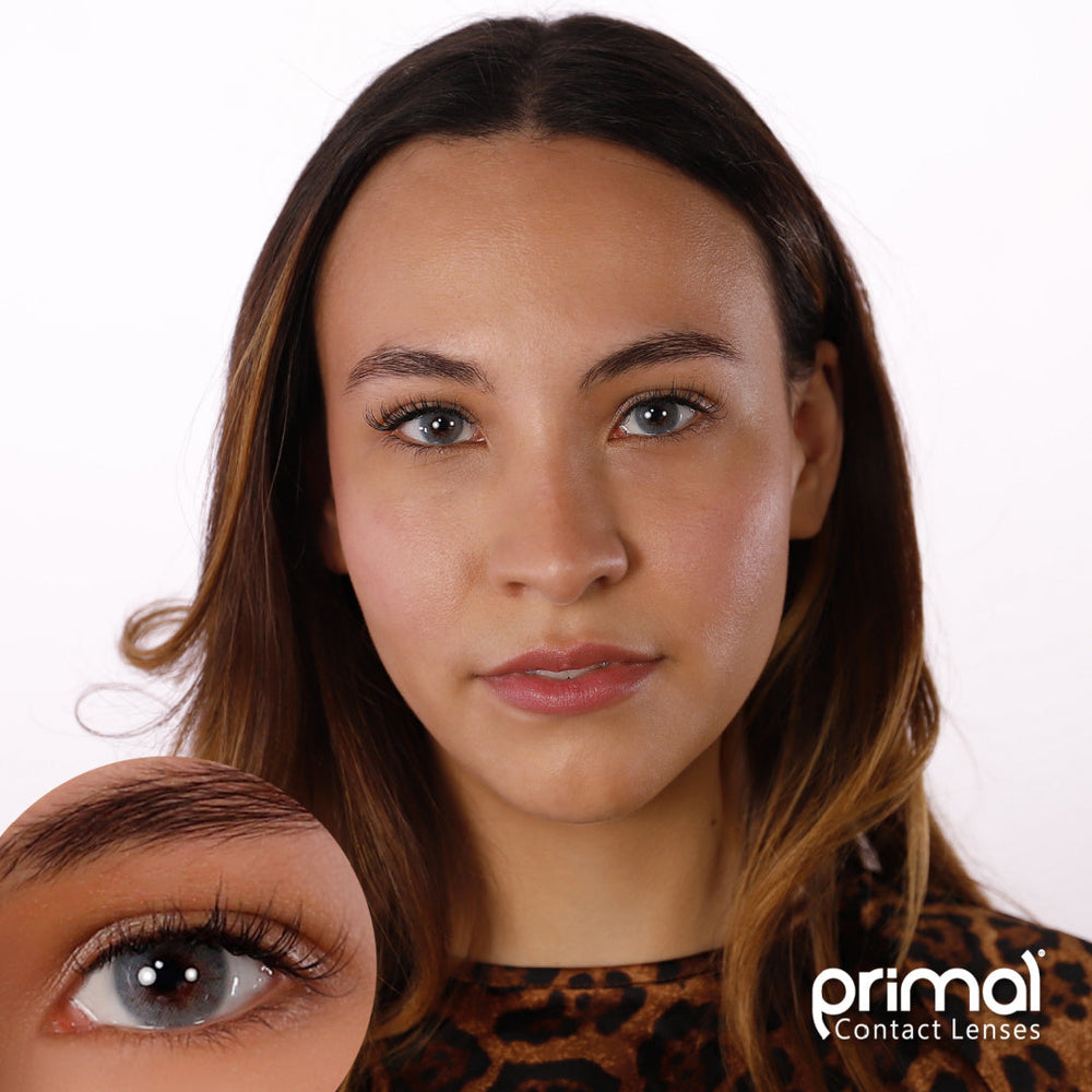 On light natural eyes, these coloured contact lenses show off their soft side, in subtle blue-grey shades.