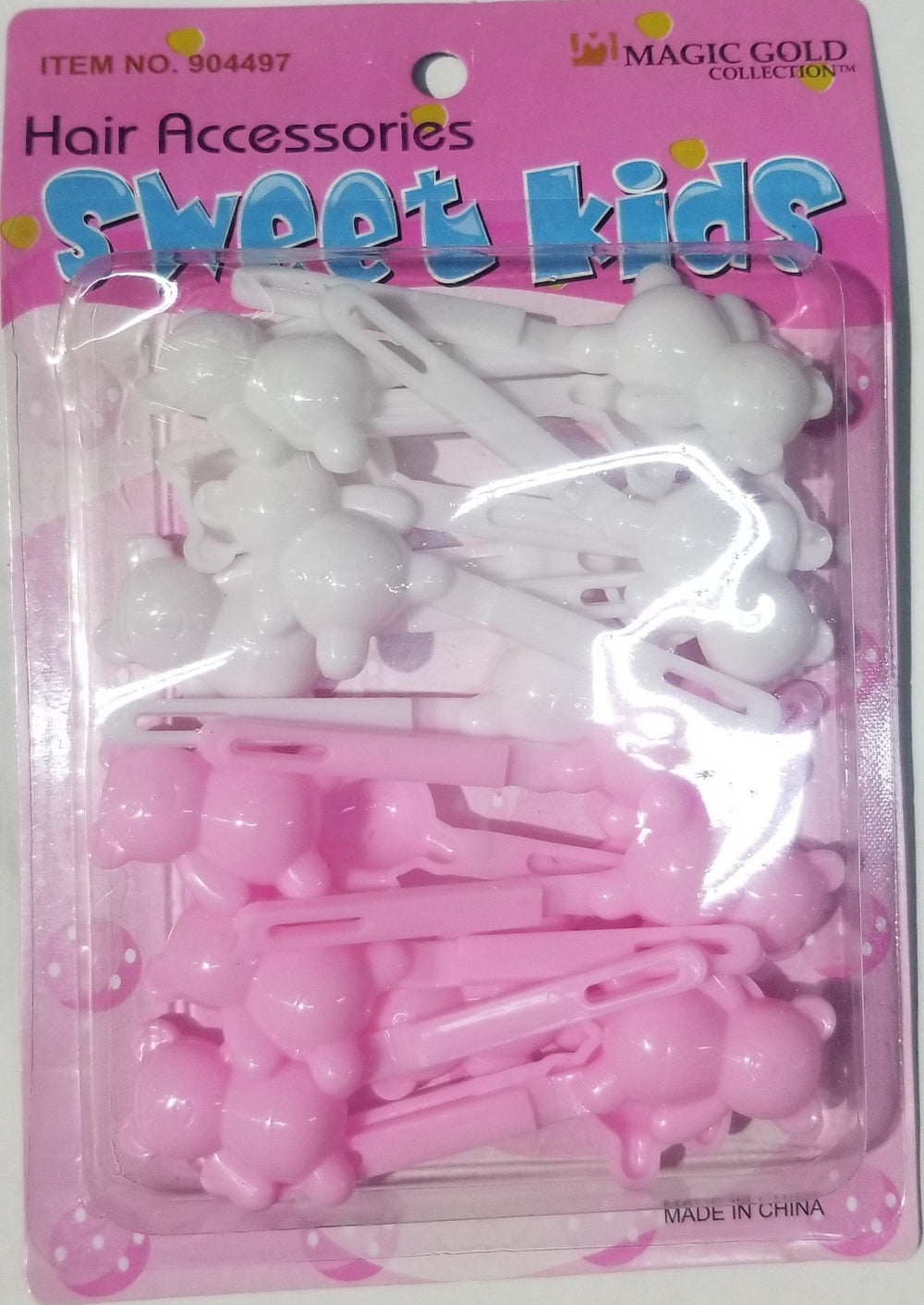 This pack includes 18 bear shaped barrettes in light pink and white.